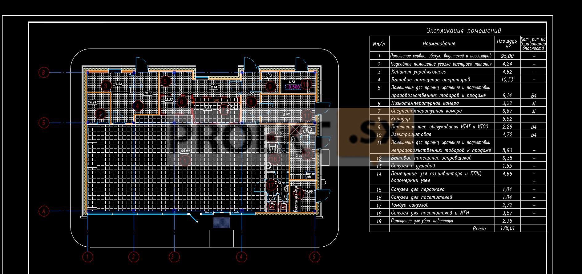 Проект автозаправочной станции разработан на основании задания на проектирование и градостроительного плана земельного участка. В соответствии с заданием предполагается разместить на данной территории автозаправочную станцию на 500 заправок для обслуживания автотранспорта неэтилированными бензинами и дизельным топливом, а также торговли сопутствующими товарами. В пятне застройки имеются инженерные сети. Жилая застройка в районе АЗС отсутствует. За условную отметку 0,000 принят уровень чистого пола зданий, соответствующий отметке +18,400. Максимальный уровень поднятия грунтовых вод ожидается на абсолютных отметках + 17,00-+17,500. В состав АЗС для заправки одновременно шести автомашин входят: здание операторной, общей площадью здания – 178,01м2; навес с организованным отводом дождевых вод над 3-мя топливораздаточными островками (с внутренними водостоками и электроподогревом); топливораздаточные колонки (ТРК) – 3 шт.; подземные топливные двухсекционные резервуары ёмкостью 50 м3 – 3 шт. (расположены рядом с площадкой АЦ); аварийный подземный резервуар ёмкостью 15 м3 – 1 шт. (расположен рядом с площадкой АЦ); резервуары противопожарного запаса воды ёмкость 50 м3 – 2 шт. площадка для автоцистерны (АЦ ЖМТ); мусоросборник для сбора бытовых отходов; рекламная стела и другие рекламные носители, информационные указатели; стоянка для легковых автомобилей на 4 м/м (в т.ч. 1 м/м для инвалидов). площадка ДГУ. Запроектированное здание операторной с магазином и кафетерием представляет собой одноэтажный прямоугольный в плане объем с размерами в осях 17,33х10,61м и высотой 4,04 м. Главный вход запроектирован в торговый зал с установкой металлопластиковой остекленной двери. Вход в здание для посетителей запроектирован по пандусу. Нижняя часть входных остекленных дверей на высоту 0,3 м защищается противоударной полосой. Проектом предусмотрен беспрепятственный доступ инвалидов и маломобильных групп населения к зданию автозаправочной станции. Так же в здании предусмотрено 3 служебных двери с обратной стороны фасада. Отдельный вход для обслуживания помещения электрощитовой, вход в помещение операторов и кабинет управляющего, отдельная дверь в коридор, через который осуществляется загрузка продуктов для буфета и магазина. В состав помещений здания операторной входят: Помещение сервисного обслуживания водителей и пассажиров площадью 95,0 кв.м; Подсобное помещение уголка быстрого питания площадью 4,24 кв.м; Кабинет управляющего площадью 4,62 кв.м; Бытовое помещение операторов площадью 10,33 кв.м; Низкотемпературная камера площадью 3,22 кв.м; Среднетемпературная камера площадью 6,67 кв.м; Помещение для приема, хранения и подготовки продовольственных товаров к продаже площадью 9,14 кв.м; Помещение тех.обслуживания ИТАТ и ИТСО площадью 2,28 кв.м; Электрощитовая площадью 4,72 кв.м; Помещение для приема, хранения и подготовки непродовольственных товаров к продаже площадью 8,93 кв.м; Помещение для хоз.инвентаря и ППШ, водомерный узел площадью 4,66 кв.м; Санузел с душевой площадью 1,55 кв.м; Бытовое помещение заправщиков площадью 6,38 кв.м; Санузел для персонала площадью 1,04 кв.м; Тамбур санузлов площадью 2,72 кв.м; Санузел для посетителей и МГН площадью 3,57 кв.м; Санузел для посетителей площадью1,04 кв.м; Помещение для уборочного инвентаря площадью 2,38 кв.м; Коридор площадью 5,52 кв.м. Общая площадь по