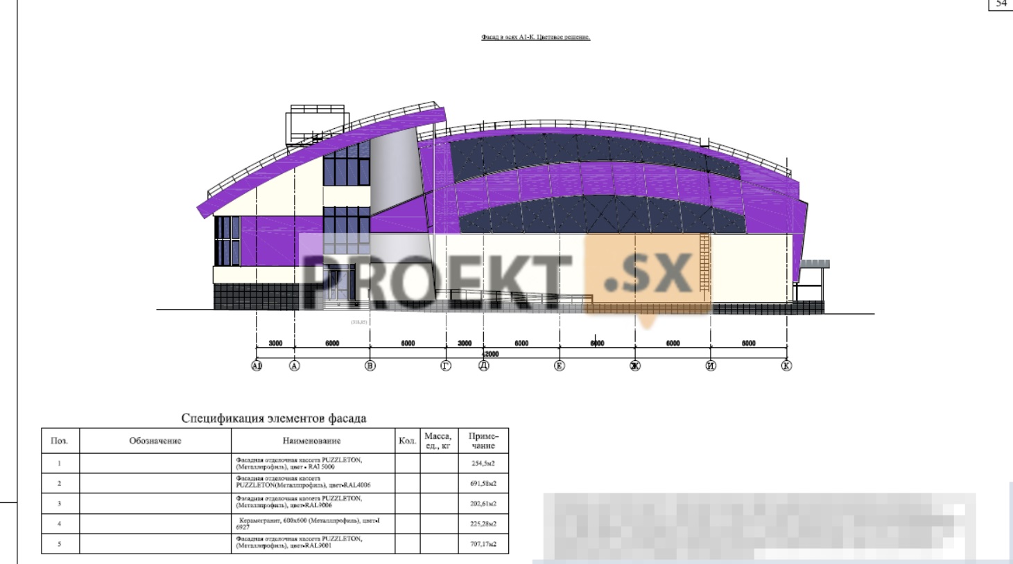Внешний вид здания представляет собой объем прямоугольной формой в плане с размерами в осях 42,00 х 46,66 м и дугообразной крышей, к которому с торца примыкает лестничная клетка, служащая для эвакуации и являющаяся акцентом в композиции всего объема, т.к. в объеме лестницы находится главный вход в здание. За условную отметку 0,000 принята отметка чистого пола первого этажа, что соответствует абсолютной отметки 319,62. Весь объем здания делится на две части: первая часть ‒ это универсальный игровой зал с габаритными размерами 42 х 27 м и высотой до низа выступающих конструкции – 9,05 м; вторая часть ‒ это 3-х этажный объем с высотами этажей – 3 м, 3,9 м и переменной высотой 3-го этажа (чердака), связанных между собой вертикальными коммуникациями, в котором располагаются вспомогательные помещения игрового зала (такие как раздевальные, администрация, обслуживающий персонал, буфет и т. д.), тренажерный зал, зал для занятий аэробикой, зал ОФП для настольного тенниса на 4 стола с зоной отдыха, инженерные помещения). В объекте используется коридорная схема группировки помещений, что позволяет связать между собой все части единого функционального процесса и учесть принцип поточности занимающихся. Перечень помещений принят в соответствии с техническим заданием и установленными нормами и правилами. Вход в здание организован с двух сторон – в осях «1/Б-В» и «8-9/Б-В». Для въезда инвалидов на колясках предусмотрен пандус в осях «8-9/В-Е». Предусмотрено 3 эвакуационных выхода из универсального спортивного зала. Для обеспечения доступа МГН на второй и третий этаж здания предусмотрена подъемная платформа (из коридора первого этажа в помещения на отметке +3,600, из коридора второго этажа в помещения на отметке +8,100). Основанием подъемника служит плита пола 1-го, 2-го этажей. Ограждающие конструкции подъемника – перегородки из монолитного железобетона толщиной 120 мм. С кровли здания по торцевым фасадам предусмотрены металлические стремянки. Кровля запроектирована чердачная, вентилируемая, из металлических профлистов, с наружным организованным водоотводом и трубчатыми снегозадержателями. На кровле устанавливается ограждение. Кровля дугообразная, покрытие кровли ‒ профнастил Н60-845-0,8 ГОСТ 24045-2016, покрытие козырьков – арочный профнастил С44-1000-0,7 ГОСТ 24045-2016. В качестве утеплителя кровли применены минераловатные плиты "ТЕХНОВЕНТ СТАНДАРТ", толщиной 250 мм, плотностью 72-88 кг/м3 и "ТЕХНОРУФ В 60" толщиной 250 мм, плотностью 165-195 кг/м3, горючесть ‒ НГ, выполненные по ТУ 5762-010- Наружные стены – стеновые сэндвич-панели поэлементной сборки МП СП – 150х595, толщиной 1 мм (с полимерным покрытием), фирмы "Металлпрофиль", с облицовкой фасадными кассетами PUZZLETON фирмы "Металлпрофиль". В качестве утеплителя наружных стен применены минераловатные плиты "ТЕХНОВЕНТ СТАНДАРТ" толщиной 200 мм, плотностью 72-88 кг/м3, горючесть – НГ, выполненные по ТУ 5762-010-74182181-2012. Ограждающие стены лестничной клетки в осях «1-2/А-Б» выполнены из монолитного железобетона толщиной 350 мм, утепление стен лестничной клетки выполнено минераловатными плитами "ТЕХНОВЕНТ СТАНДАРТ" толщиной 200 мм, плотностью 72-88 кг/м3, горючесть – НГ, выполненными по ТУ 5762-010-74182181-2012, с применением фасадных кассет PUZZLETON наружной навесной фасадной системы "Металлпрофиль". Стены лестничной клетки в осях «8-9/А1-Г» выполнены из стеновых сэндвич-панелей 