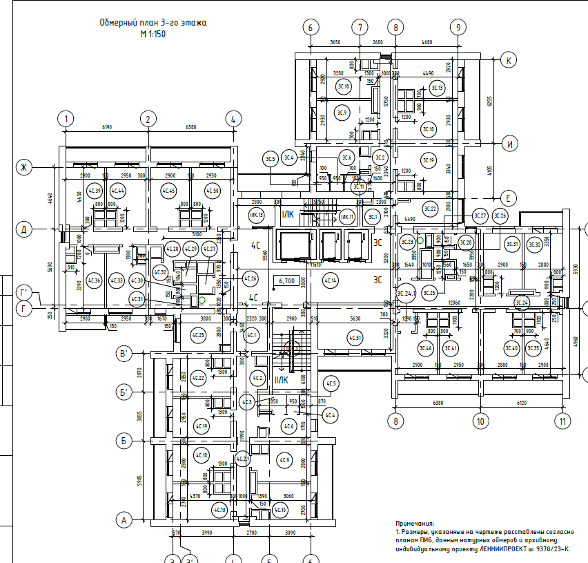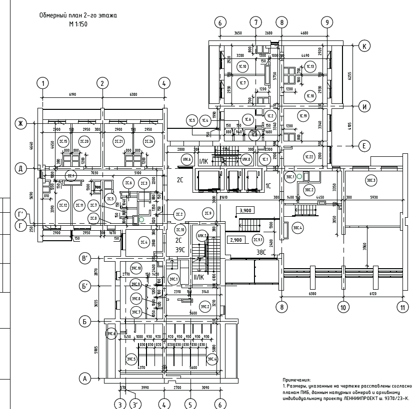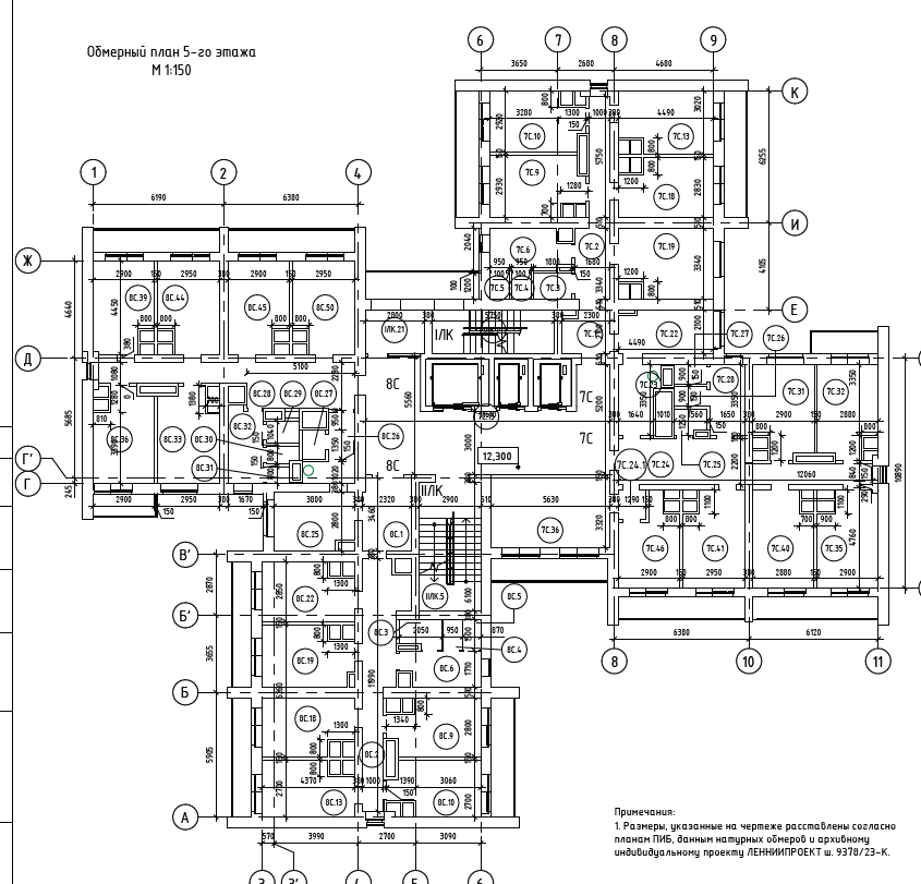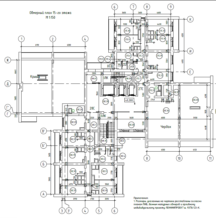 Объект - существующее здание общежития 1980-го года постройки по индивидуальному проекту ЛЕННИИПРОЕКТ ш.9378/23-К «Общежитие на 586 мест с буфетом на 24 места». Объект представляет собой разноуровневое 13-14-15-ти этажное кирпичное здание. Кроме того, имеет технический этаж и подвал. В плане имеет сложную форму с выступающими объемами, образованную четырьмя секциями, расположенными с северной, западной, южной и восточной сторон от пространства общего назначения – лестнично-лифтового холла. Фундамент здания железобетонный сборный ленточный из фундаментных подушек и стеновых блоков. Междуэтажные перекрытия из сборных железобетонных многопустотных и плоских плит. Кровля плоская рулонная по покрытию из сборных железобетонных плит. Несущие и ограждающие стены кирпичные, внутренние перегородки помещений – из гипсокартонных листов и деревянных материалов. Прочность, пространственная жесткость, устойчивость и геометрическая неизменяемость здания обеспечивается совместной работой конструкции фундамента, стен, конструкций перекрытий.