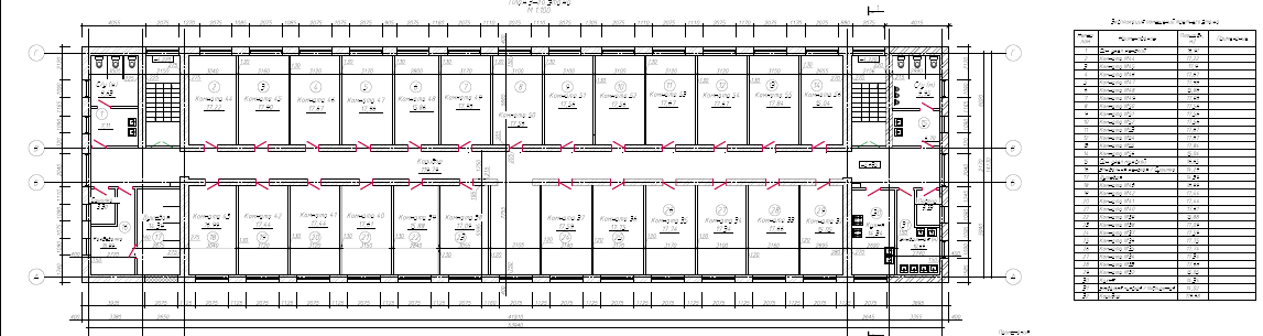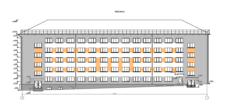 Здание общежития для студентов 1966 г. постройки – 5 этажное с подвалом и чердачным помещением. Общие габаритные размеры здания – 55,0х14,9 м, высота здания 14,5 м (высота этажей – 2,6 м). Количество жилых комнат – 99. Общая полезная площадь здания – 3991,1 кв.м., в т.ч.: жилые помещения (полезная площадь) – 2985,2 кв.м; в т.ч. жилой площади – 1712,2 кв.м. Объем здания – 14146 куб.м. Здание оборудовано системами инженерно-технического обеспечения (в настоящем заключении не рассматривается. Обследование систем и сетей здания предоставляется в виде отдельных томов (разделов) и т.п.). В здании имеются системы водоснабжения и водоотведения, газоснабжение, отопление и вентиляция, электроснабжение, слаботочные системы (пожарная сигнализация, видеонаблюдение, телефонизация и т.п.). В подвале здания расположены душевые, раздевалки, вспомогательные технические помещения, а также помещения хранения спортивного инвентаря (лыжная база). На первом этаже здания расположены помещения столовой с набором вспомогательных и подсобных помещений; вестибюль и читальные залы; помещения административно-управленческого персонала, а также другие вспомогательные помещения. Со 2-го по 5-й этажи в здании располагаются помещения жилых комнат с набором вспомогательных помещений. Здание общежития запроектировано в 1961 г. на основании Типового проекта № 1-300-2М «Общежитие для студентов на 400 учащихся с кирпичными стенами» (модернизированное) с привязкой к местным условиям и заданию Заказчика. В отличии от типового проекта здание запроектировано с подвалом для хозяйственных помещений. Внутренний ж/б каркас здания по типовому проекту заменен на продольные кирпичные стены с устройством в них вентиляционных каналов. На все изменения разработаны изменения и корректировки, отраженные в проектной документации В конструктивном отношении здание бескаркасное с продольными и поперечными несущими кирпичными стенами. Фундаменты здания выполнены ленточными на естественном основании - сборные из бетонных фундаментных блоков типа ФБС, подошва фундаментов – из сборных ж/б блоков по типу ФЛ. Стены подвала – сборные ж/б блоки с докладкой из керамического полнотелого кирпича марки М100 на растворе марки М50, толщина стен подвала – 510 мм. Наружные стены – из семищелевого кирпича, толщина стен 510 мм. Внутренние стены из силикатного кирпича. Столбы на 1-м этаже выполнены сечением 770х640 мм из кирпича марки М100 на растворе М50 с армированием кладочной сеткой. Для общей жесткости здания на отм. -0,450 м, -1,80 м, -2,40 м, - 3,00 м, + 8,065 м, +13,665 м в здании выполнены железобетонные диафрагмы из бетона марки М200 и арматуры из стали Ст5. Перегородки здания в сухих помещениях – из гипсоопилочных плит толщиной 80 мм; в санузлах и душевых – из шлакоблоков толщиной 90 мм. Перекрытия – из сборных железобетонных панелей с круглыми пустотами и из плоских железобетонных плит. Лестницы – сборные ж/б лестничные площадки и марши. Кровля здания скатная – стропильная система из деревянных элементов.