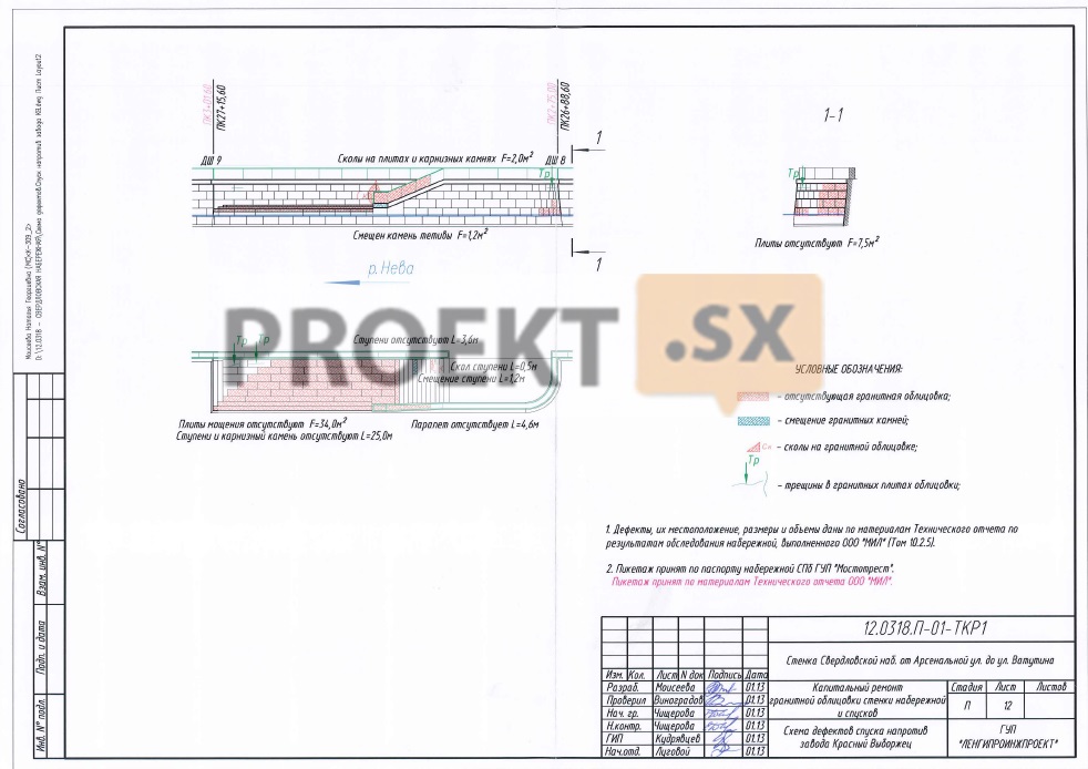 Дефекты облицовки в виде утраты плит гранитной облицовки, трещин и сколов выявлены на ограниченных по площади участках, главным образом у деформационных швов. Проектной документацией предусмотрено устранение повреждений облицовки в зоне деформационных швов, выполняемое вместе с ремонтом самих деформационных швов. При температурных деформациях набережной отремонтированные деформационные швы позволят избежать расстройства гранитной облицовки на прилегающих к шву участках. Конструкция шва: вертикальное уплотнение - герметизация шва между сборными блоками полиуретановым жгутом и заделка шва по фасадной грани блоков резиной марки НО-68-1 с креплением к бетону блоков анкерами-шурупами HUS-HR (Hilti); вертикальное уплотнение - герметизация шва между гранитными плитами навесной облицовки полиуретановым жгутом и разделка шва с фасада полиуретановой двухкомпонентной герметизирующей мастикой ТЭКТОР-203 (ТУ 5772-001-50002263-98) или двухкомпонентным полисульфидным (тиоколовым) отверждающимся герметиком АМ-05 с заполнением шва на глубину до 10 мм. Ширина шва не более 20 мм. Дефекты навесной гранитной облицовки в виде мелких утрат и сколов подлежат мастиковке составом на основе полиэфирных смол. Камни карниза и парапета, имеющие трещины и сколы, в соответствии с техническими условиями подлежат замене.