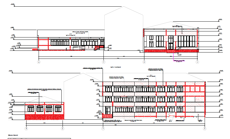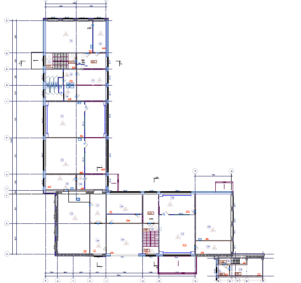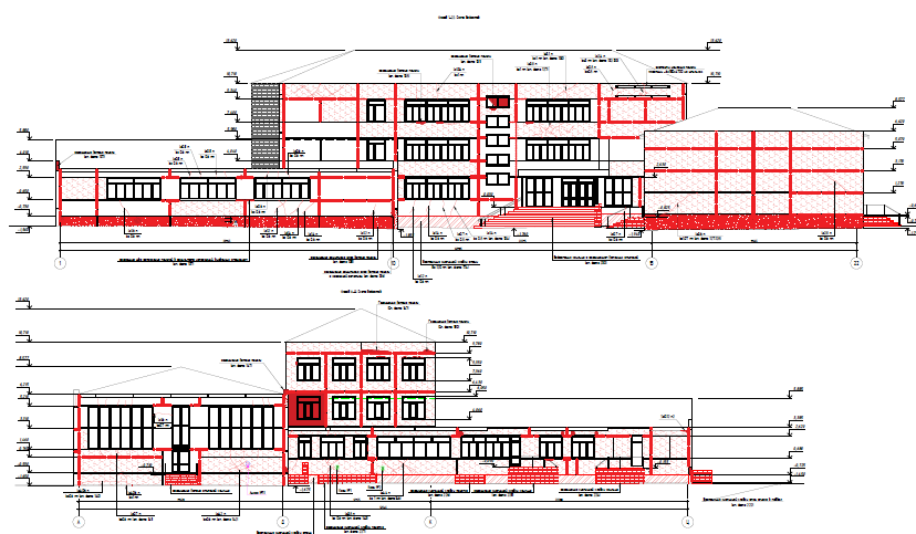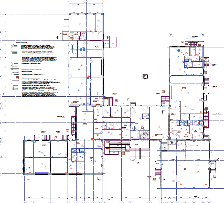 Здание школы построено по типовому проекту 221-1-313, сложной формы в плане. Размеры здания в осях 68,61х64,47 м. Условно, здание школы разделено на 5 блоков: Блок «А» – 3-х этажный, с подвалом, расположен в осях 6-14/Е-К. Блок имеет размеры в осях 34,4х12,0 м. В блоке «А» расположен главный вход в школу, а также следующие помещения вестибюль с гардеробом, рабочие кабинеты, кабинет директора, электрощитовая, серверная, учебные классы, кладовые, санитарные комнаты. Блок «Б» – 3-х этажный, с подвалом, расположен в осях 5-9/Л-Э. Блок имеет размеры в осях 33,6х12,0 м. В блоке «Б» расположены следующие помещения - учебные классы, лаборантские, кладовые, санитарные комнаты. Часть подвальных помещений здания оборудованы под спортивные учебные классы. Блок «В» – одноэтажный, с подвалом, расположен в осях 1-9/Б-Д. Блок имеет размеры в осях 28,8х12,14 м. В блоке «В» расположены следующие помещения - кабинет технологии (мальчиков и девочек), учебные классы, кладовые, санитарные комнаты, помещение медицинского пункта. 4. Блок «Г» – одноэтажный, с подвалом, расположен в осях 15-19/Е-Ц. Блок имеет размеры в осях 34,4х11,96 м. В блоке «Г» расположены следующие помещения - обеденный зал с кухонными помещениями, умывальная, кабинет заместителя директора по АХЧ, тренажёрная, санитарные комнат, раздевальные помещения для мальчиков и девочек при спортивном зале (с душевыми). 5. Блок «Д» – одноэтажный, без подвала, расположен в осях 13-20/А-Д. Блок имеет размеры в осях 17,8х17,6 м. В блоке «Д» расположены следующие помещения – актовый и спортивный зал, подсобные помещения. Фундаменты блоков «А», «Б», «В» и «Г» - свайный, с монолитным железобетонным ленточным ростверком, шириной 360-1220 мм, высотой сечения 400 - 600 мм. Столбчатые ростверки размером в плане 2300х2300 мм, высотой 1000 - 1060 мм. Фундаменты блока Д здания – столбчатые на забивных сваях. Продольное армирование ростверко выполнено арматурой класса АIII ф10-14 мм, поперечное арматурой класса АI ф8 мм. Сваи забивные железобетонные квадратного сечения 300х300мм, шаг свай от 1,2 до 3,9м, длина свай составляет 5,8 м. Продольное армирование свай выполнено арматурой класса АIII ф10 мм, поперечное арматурой класса АI ф6 мм. Прочность бетона железобетонных свай соответствует класссу В25-В50, прочность бетона ростверков соответствует классу В25-В35. Сопряжение ростверков со сваями предусмотрено с заделкой в тело ростверка выпусков арматуры на 250 мм, что согласно СП 24.13330.2021 "Свайные фундаменты" является жестким спряжением. По существующим ростверкам блока «В», «Г» и «Д» предусмотрено устройство железобетонных фундаемнтных балок сечением 400х500(h) мм, из бетона кл. В20, F1 150, W4, армированные арматурой класса А400 из стали марки 25Г2С по ГОСТ 5781-82 и горячекатаная арматурой класса A240 из стали марки Ст3пс по ГОСТ 5781-82. Плиты перекрытия и покрытия – сборные железобетонные преднапряженные (для пролетов 6,4м и 7,2м) и с обычным армированием (для пролетов 3,2м) многопустотные, толщиной 220 мм, с опиранием по двум сторонам на наружные и внутренние стеновые панели и доборные ригели. В бдлоке «Д» опирание плит покрытия выполнено по двум сторонам на ж/б тавровые балки. Плиты перекрытия длиной 3,2 м армированы пятью стержнями арматуры класса АIV ф14 мм, плиты перекрытия длиной 6,4 м армированы четырьмя стержнями арматуры класса АIV ф14 мм, плиты перекрытия длиной 7,2 м армированы четырьмя стержнями арматуры класса АIV ф18 мм
