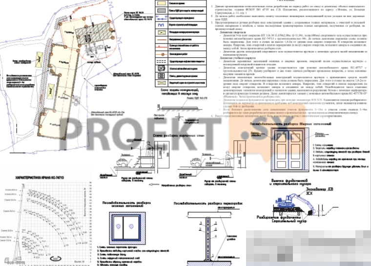 Представлены основные решения по последовательности, способам работ, мероприятия по охране труда, технике безопасности, пожарной безопасности, условия сохранения окружающей среды, решения по вывозу и утилизации отходов сноса. Предусматривается снос существующего здания. При подготовке объекта к сносу выполняется отключение сносимого здания от инженерных сетей, устройство временного ограждения зоны работ с обозначением зон развалов и опасных зон, исключающим проникновение людей и животных в зону работ, въезда-выезда на площадку, административно-бытовых зданий, временных сетей электроснабжения, водоснабжения и связи, защита существующих сетей инженерно- технического обеспечения. Демонтаж здания предусматривается методом поэлементной разборки вручную с применением средств малой механизации в направлении «сверху- вниз», конструкций кровли - автомобильным краном грузоподъемностью 25,0 т, плит покрытия спортивного зала - автомобильным краном грузоподъемностью 80,0 т. Работы с применением автомобильных кранов ведутся с использованием оттяжек. Демонтаж фундаментов и подземной части здания выполняется в котловане с естественными откосами экскаваторами с навесным разрушающим оборудованием, вблизи существующих сетей - не демонтируются. При сносе здания с применением экскаватора во избежание пылеобразования, обрушаемые конструкции обильно смачиваются водой поливомоечной машиной, а также вручную из шлангов. Существующие инженерные сети, попадающие в зону развала, защищаются сборными железобетонными дорожными плитами, уложенными на песчаное основание. По границам опасных зон и зон развала устанавливается временное сигнальное ограждение. Разборка, погрузка строительного мусора и отходов от сноса предусматриваются с применением экскаватора.
