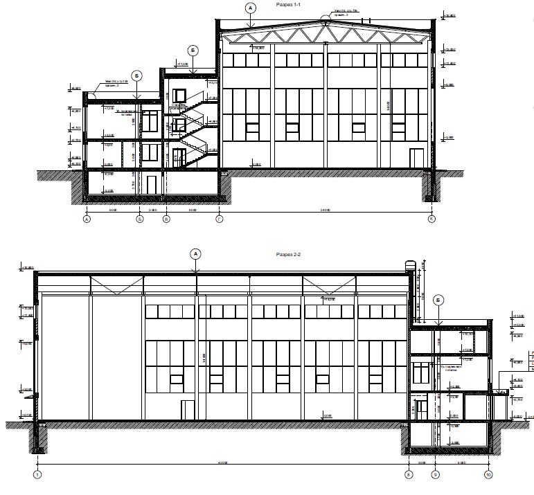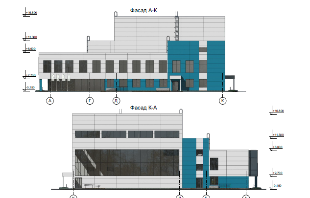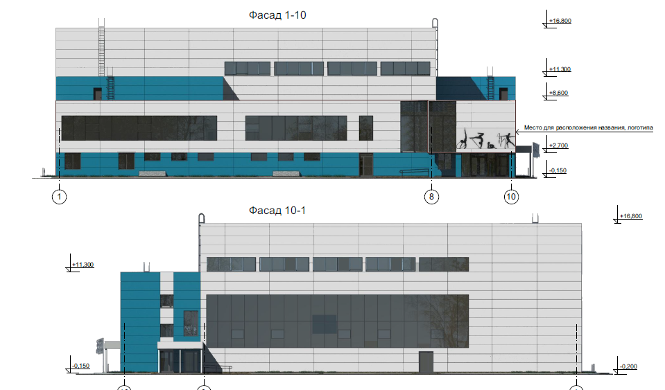 Архитектурные решения здания спортивного зала лаконичны - объем следует за функциональными параметрами сооружения. Облик здания формируется на контрасте одноэтажного объема универсального спортивного зала, доминирующего по высоте, и двухэтажной части постройки. Главный вход в здание организован с угла, акцентирован выступающим, нависающим объёмом второго этажа. Данное планировочное решение позволяет организовать оптимальное функциональное зонирование здания, распределение потока посетителей, занимающихся, административного и обслуживающего персонала. Проектируемое здание, прямоугольное в плане, имеет габариты 51,0 х 39,0 м в крайних осях. Высота 1-го этажа двухэтажной части здания (от пола до пола следующего этажа) 3,3 м, высота 2-го этажа 3,9 м (в чистоте), технического этажа 2,5 м (в чистоте). Отметка высоты основного парапета +8,600; отметка высоты парапета лестничных клеток и технических надстроек +11,300. Высота универсального зала до низа конструкций 14,0 м, отметка высоты парапета +16,800. Технический этаж (техподполье) располагается только под двухэтажной частью здания и предназначен для размещения инженерных коммуникаций и технических помещений : ИТП, водомерного узла, электрощитовой. Техэтаж имеет два выхода непосредственно на улицу по лестницам в приямке и аварийный выход через окно дымоудаления (проём 1200х1600(h)) с приямком, оборудованным металлической стремянкой. Для защиты от шума в помещении ИТП предусмотрена шумоглушащая отделка, помещение расположено таким образом, что над ними нет постоянных рабочих мест. На первом этаже здания расположены: вестибюль главного входа с открытой лестницей на второй этаж и лифтами, помещение охраны, гардероб, стойка и кабинет администраторов, универсальный спортивный зал 42,0 х 24,0 м с телескопическими раздвижными трибунами на 150 зрителей (включая МГН), раздевалки, тренерская, дикторская (радиоузел для обеспечения музыкального сопровождения), медицинский блок, буфет с загрузочной и вспомогательными помещениями, санузлы для посетителей ( в том числе для МГН), служебные помещения технического персонала. Главный вход в здание имеет теплый тамбур габаритом 2,85 (глубина) х 5,96 м, раздвижные и двустворчатые витражные двери, свободную входную площадку, пандус с уклоном 1:20 и поручнями для обеспечения доступа маломобильных групп населения. Кроме главного входа в здании предусмотрены необходимые эвакуационные выходы из лестничных клеток и спортивного зала с местами для зрителей. На втором этаже расположены: зал для хореографии (на 15 чел.), тренажерный зал (на 10 чел.), раздевалки, инструкторская, дикторская, конферен-зал (судейская), методический кабинет, административные и служебные кабинеты, санузлы (в том числе для МГН) и помещения вспомогательного назначения. Все раздевалки, помещения для тренеров и спортсменов-инструкторов имеют выходы в изолированный коридор с лестничной клеткой, что обеспечивает удобную функциональную связь со всеми спортивными залами, расположенными поэтажно. В соответствии с заданием на проектирование, в котором прописана возможность трансформирования универсального зала для занятий и проведения соревнований по другим видам спорта, в том числе с участием спортсменов-инвалидов ПОДА (6 чел.), предусмотрены специальные раздевалки для МГН на первом этаже. Для обеспечения эв