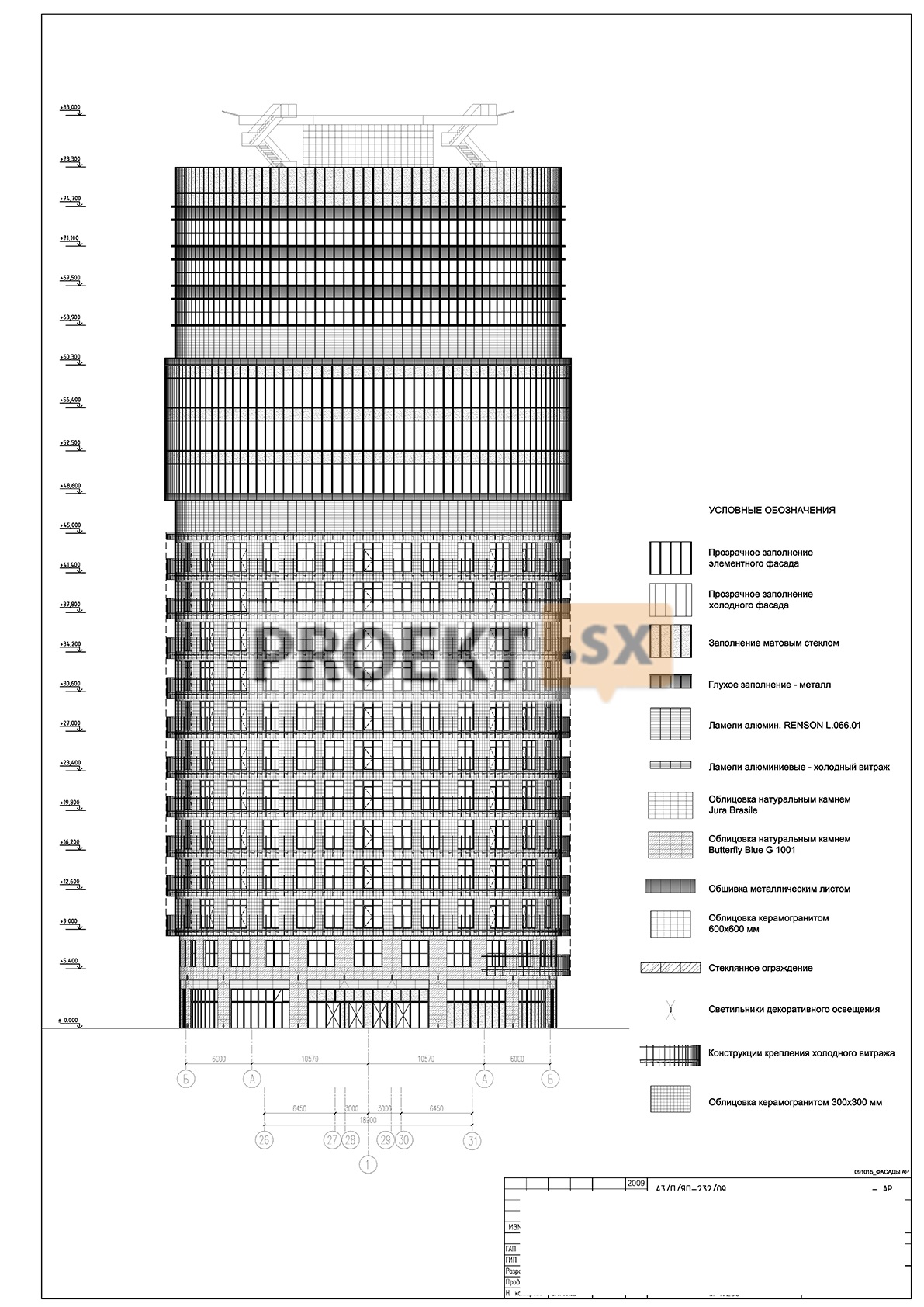 Запроектированное здание лечебно-реабилитационного комплекса (корпус № 2) состоит из трех частей разной высоты и формы, объединенных единым подвалом. Отдельные части (блоки), начиная от улицы, пронумерованы, соответственно Блок 1, Блок 2, Блок 3. В запроектированном здании предусмотрена возможность устройства соединительных переходов в клинико-поликлинический корпус и Перинатальный центр. Предусматривается размещение вертолетной площадки на крыше здания для экстренной доставки трансплантантов и возможности обеспечения аварийно-спасательных мероприятий в случае пожара. При этом вертолетная площадка разрабатывается отдельным проектом и проектная документация по ней данным проектом не рассматривались. Подвал корпуса № 2 предназначен для горизонтальной технологической связи трех блоков. Через подвал предусматривается загрузка здания и удаление мусора по изолированным коридорам. В подвале также предусмотрено размещение раздевалок медицинского персонала и технических помещений. Блок 1 – самая высокая часть здания - 20 эт., в которой запроектировано: вестибюль с приемными боксами - 1 эт.; палатные отделения на 300 коек - 2 -10 эт.; отделение реанимации - 11-12 эт.; операционный блок - 14-16 эт.; отделение функциональной диагностики - 18 эт.; администрация - 19 эт.; учебно-научные помещения - 20 эт.; технические этажи - 13 и 17 эт. Над кровлей здания предусмотрена возможность размещения вертолетной площадки с верхней отметкой +83,00 метра. Блок 2 запроектирован с изолированным входом, 3-этажным, с многофункциональным залом (на 3 этаже) с трансформируемым амфитеатром и балконом. На 1 этаже предусмотрено размещение входного вестибюля, кафе для персонала на 100 посадочных мест, помещение электрощитовой; на втором этаже – фойе с буфетом на 50 п/мест и подсобных помещений; на 3-м этаже - многофункционального зала на 600 мест (с телескопической трибуной - амфитеатром) для проведения собраний и конференций, технических и подсобных помещений. На верхнем уровне амфитеатра многофункционального зала (на отм.+12. 900) предусмотрены технические и подсобные помещения и выходы из зала. На уровне балкона (на отм.+15.900) запроектированы технические и подсобные помещения. На отм.+18. 900 предусмотрен балкон с местами для зрителей. На 1 этаже также запроектирована одноэтажная часть блока 2, связывающая входной вестибюль блока 2 с вестибюлем блока 1. Блок 3 – трехэтажный кубический объем с изолированным входом. На первом этаже блока запроектированы банк пуповинной крови и криохранилище, на втором этаже - магнитно-резонансный и компьютерный томографы, на третьем этаже - рентген. В наружной отделке фасадов здания лечебно-реабилитационного комплекса (корпус № 2)проектом предусмотрено: Фасады блока 1 запроектированы с использованием сочетания полированного гранита и остекления (первые два этажа); керамогранита и стеклянных экранов на балконах с 3 по 12 эт.; декоративных ламелей в зонах техэтажей (13 и 17 эт); элементного остекленного фасада с 14 по 20 эт.; светлого керамогранита в зоне выхода на кровлю. Фасады блока 2 запроектированы с использованием сочетания полированного гранита в зоне цоколя; остекления и декоративных ламелей в зоне 1 эт. известняка (коробка многофункционального зала); Фасады блока 3 запроектированы с использованием сочетания черного полированного гранита и остекления. 